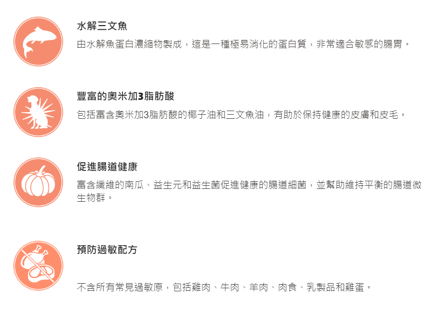 適合有消化問題的寵物:為成年和老年寵物提供量身訂製的營養,非常適合有食物敏感、消化問題或皮膚病的寵物。