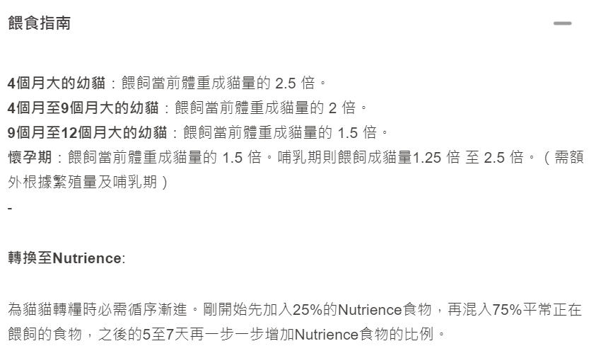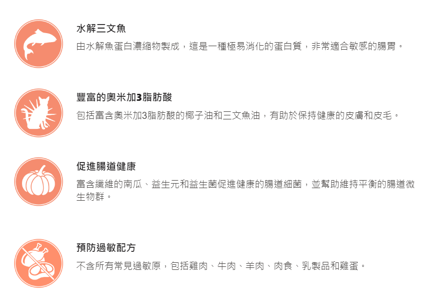 Nutrience Care® 過敏皮膚及腸胃 貓用配方是一種食材經過嚴選的的無麩質飲食,專為對食物敏感或容易出現消化問題的貓貓設計。該配方不含所有常見過敏原,包括雞肉、牛肉、羊肉、乳製品、雞蛋、肉粉、麩質、大豆和穀物。並由新鮮三文魚(一種新興蛋白質)和水解魚蛋白濃縮物混合製成,可減少過敏機會並促進消化。水解蛋白非常適合腸胃敏感或需要低過敏性飲食的寵物。