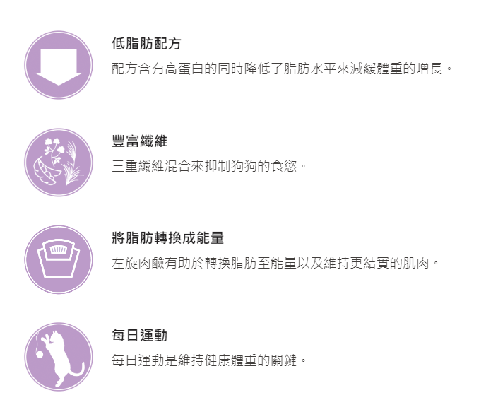 體重管理支持:採用優質蛋白質和低脂肪成分配製而成,有助於維持瘦肌肉質量並促進寵物的健康體重。
