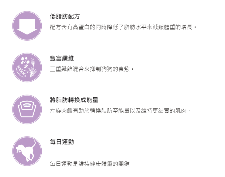 體重管理支持:採用優質蛋白質和低脂肪成分配製而成,有助於維持瘦肌肉質量並促進寵物的健康體重。