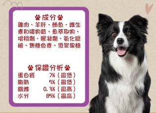 雞肉、羊肝、鮪魚、維生素和礦物質、魚萃取物、增稠劑、膠凝劑、膽鹼、焦糖色素、低聚果糖