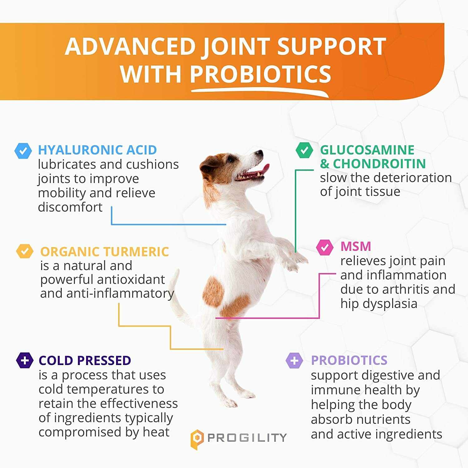 共同支持軟骨和關節健康,減緩關節組織的退化,同時減少關節炎和髖關節發育不良引起的炎症。