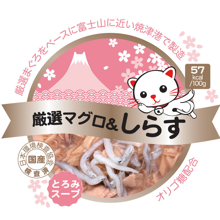 吞拿魚罐頭,上面放著貓最喜歡的銀魚,最後喝上濃湯。