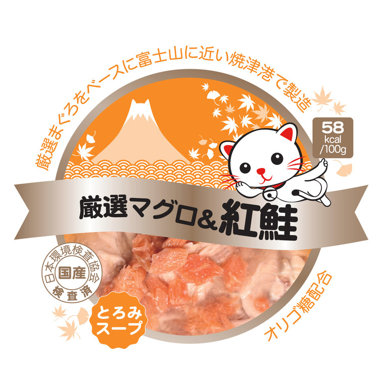 吞拿魚罐頭,上面放上貓最喜歡的三文魚,最後澆上濃湯。