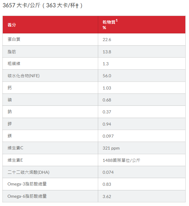 1為去除水份後產品所含的營養素百分比,經常用於直接比較不同水份含量之產品