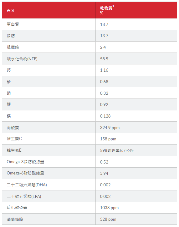 1為去除水份後產品所含的營養素百分比,經常用於直接比較不同水份含量之產品