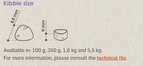 成分:脫水鮭魚 13.5%、脫水雞肉 13.5%、脫水兔肉 13.5%、木薯 13.5%、馬鈴薯、雞油 12.5%、脫水沙丁魚 11.5%、苜蓿、水解雞肝 2%、番茄乾 1%、葵花籽油、礦物質來源)、鹽類。 0.1%、水解酵母細胞壁(MOS 來源)