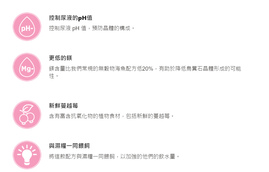 非常適合有泌尿健康需求的寵物:配方旨在支持泌尿道健康,使其成為成年和老年寵物的絕佳選擇,特別是那些控制復發性鳥糞石和草酸鈣尿石症,或易患泌尿道感染和結晶的寵物。
