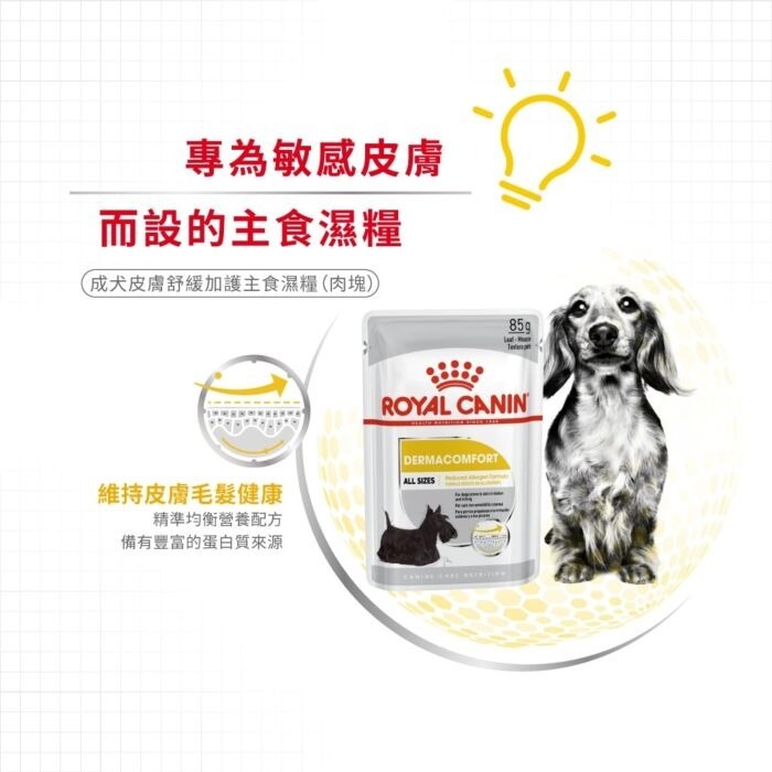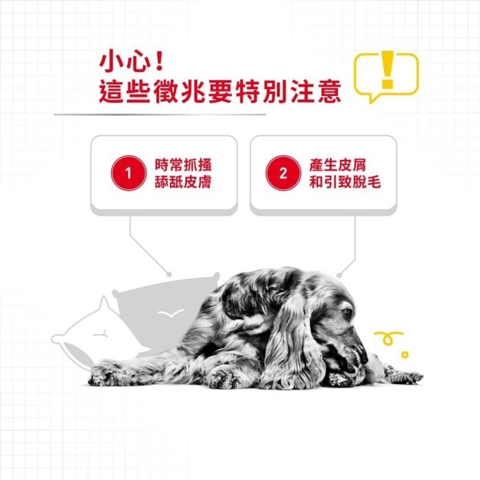 皇家犬糧的加護配方推薦給容易有皮膚刺激和搔癢的狗狗。此配方專為舒緩受刺激的肌膚而設計,並能全年促進肌膚健康。此外,該配方旨在最大程度地降低引發現有食物過敏的風險。
