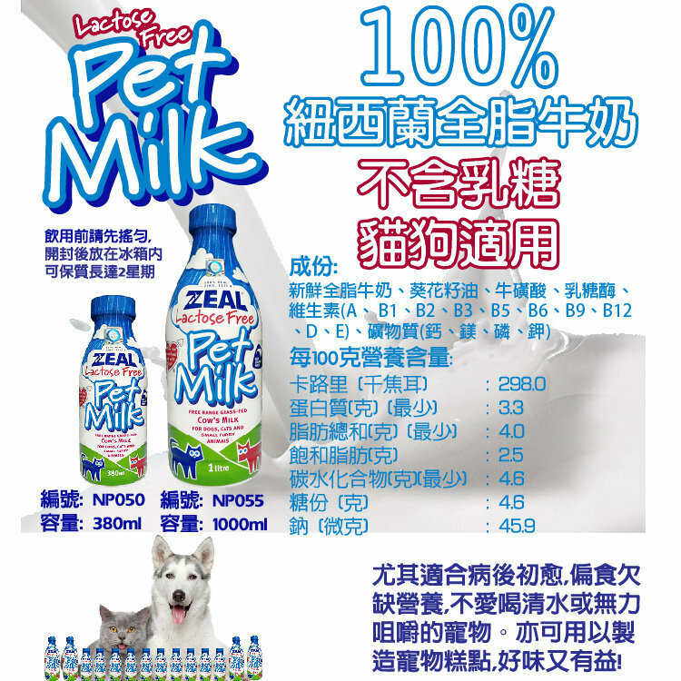 ZEAL寵物牛奶不僅不含能導致寵物腸道不適的乳糖,並加入額外營養確保寵物能獲得更均衡的養份。