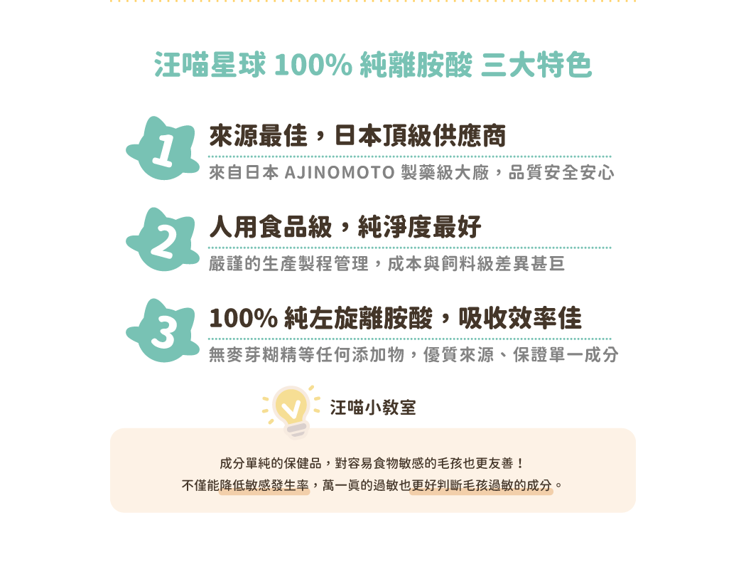 • 100%日本製藥大廠 Ajinomoto 純淨離胺酸